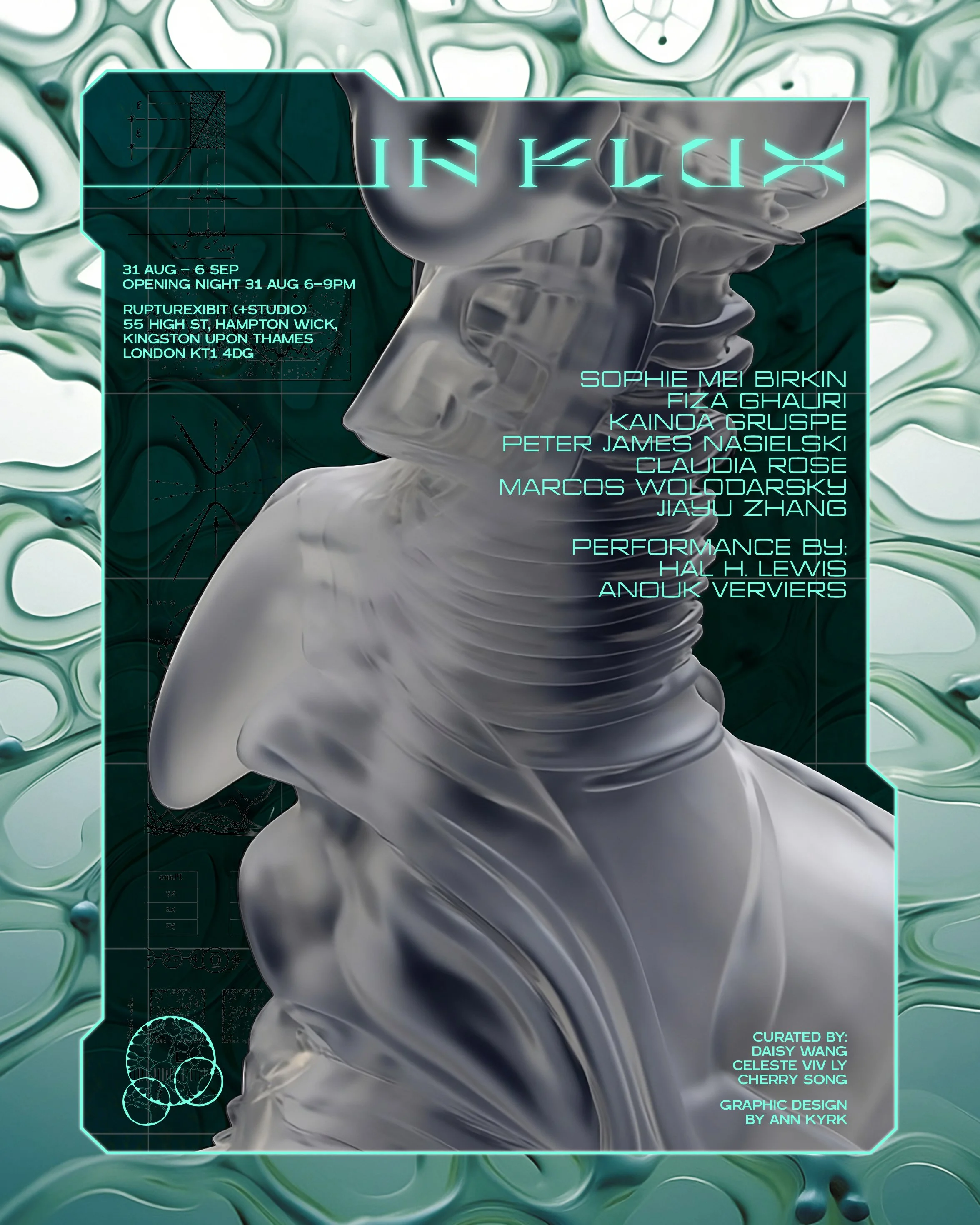In Flux is an exhibition that composes and coalesces time signatures through the hybridity and synergy of matter and the speculative confluence of systems, proposing a radical reimagining of our shared ecological and post-anthropocentric futures. Grounded in the principles of the laws of thermodynamics, it observes that energy is not created nor destroyed but perpetually in flux, undergoing constant change and phase transitions.