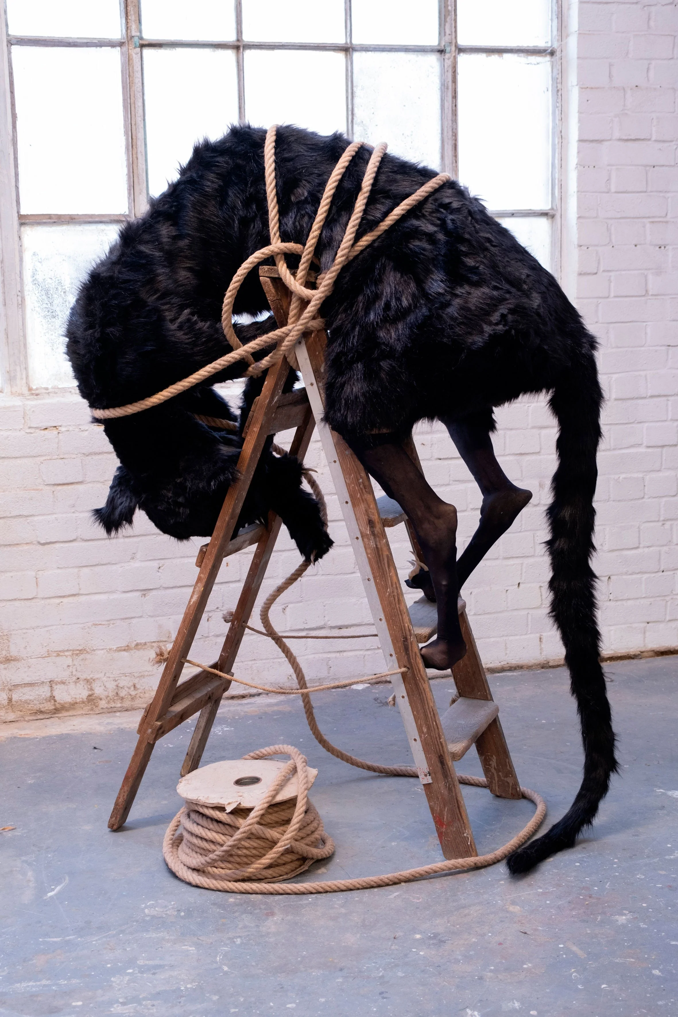 Faux fur, Latex, nylon, wadding, bio polymer, thread, rope on spool, child’s handkerchief